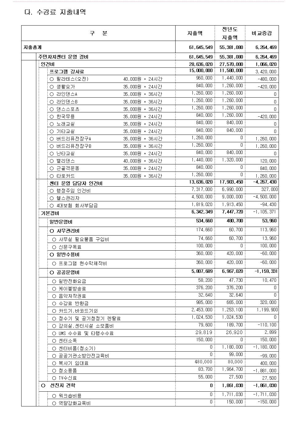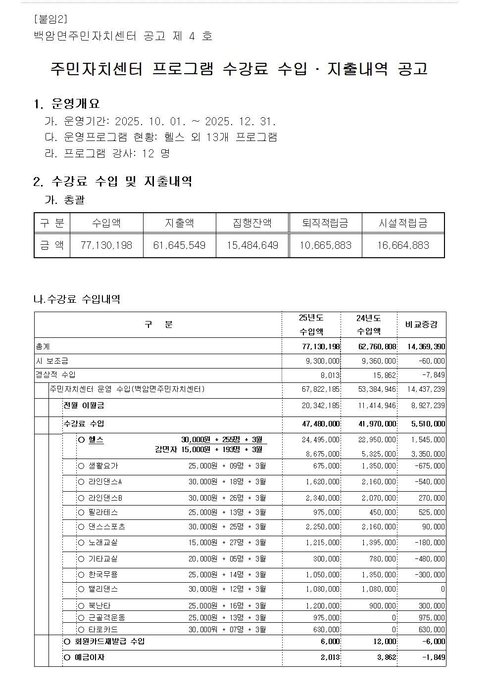 2025년 4분기(10월 ~12월 ) 수강료 수입, 지출 공고