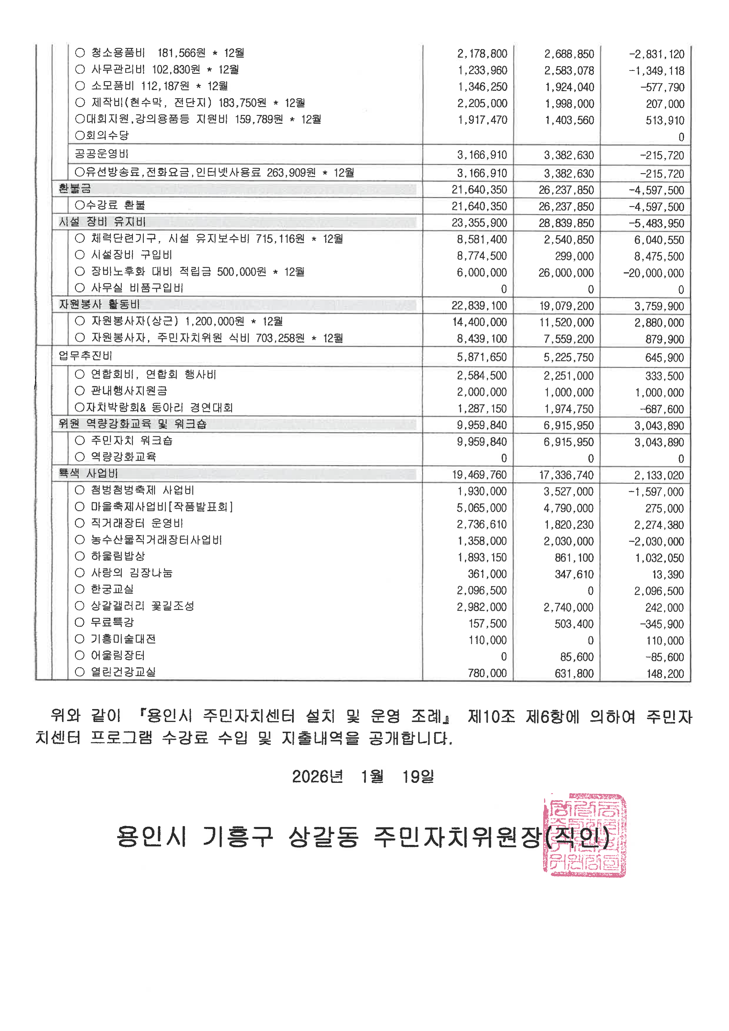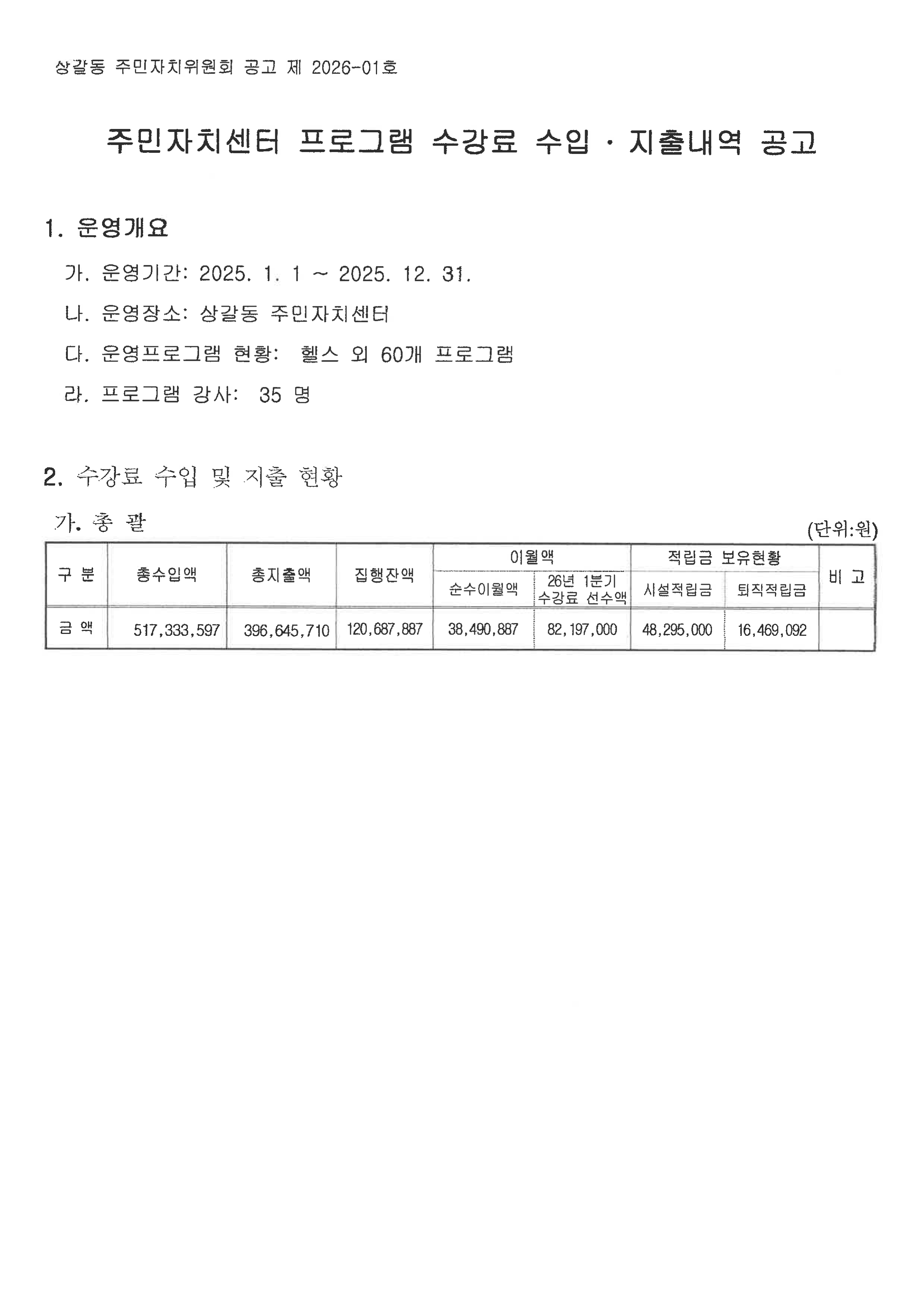 [공고 제2026-01호] 2025년 수강료 수입지출내역 공고
