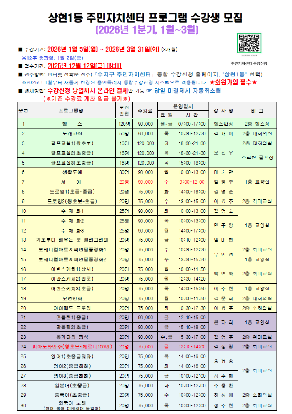 용인특례시 수지구 주민자치센터 통합 수강신청